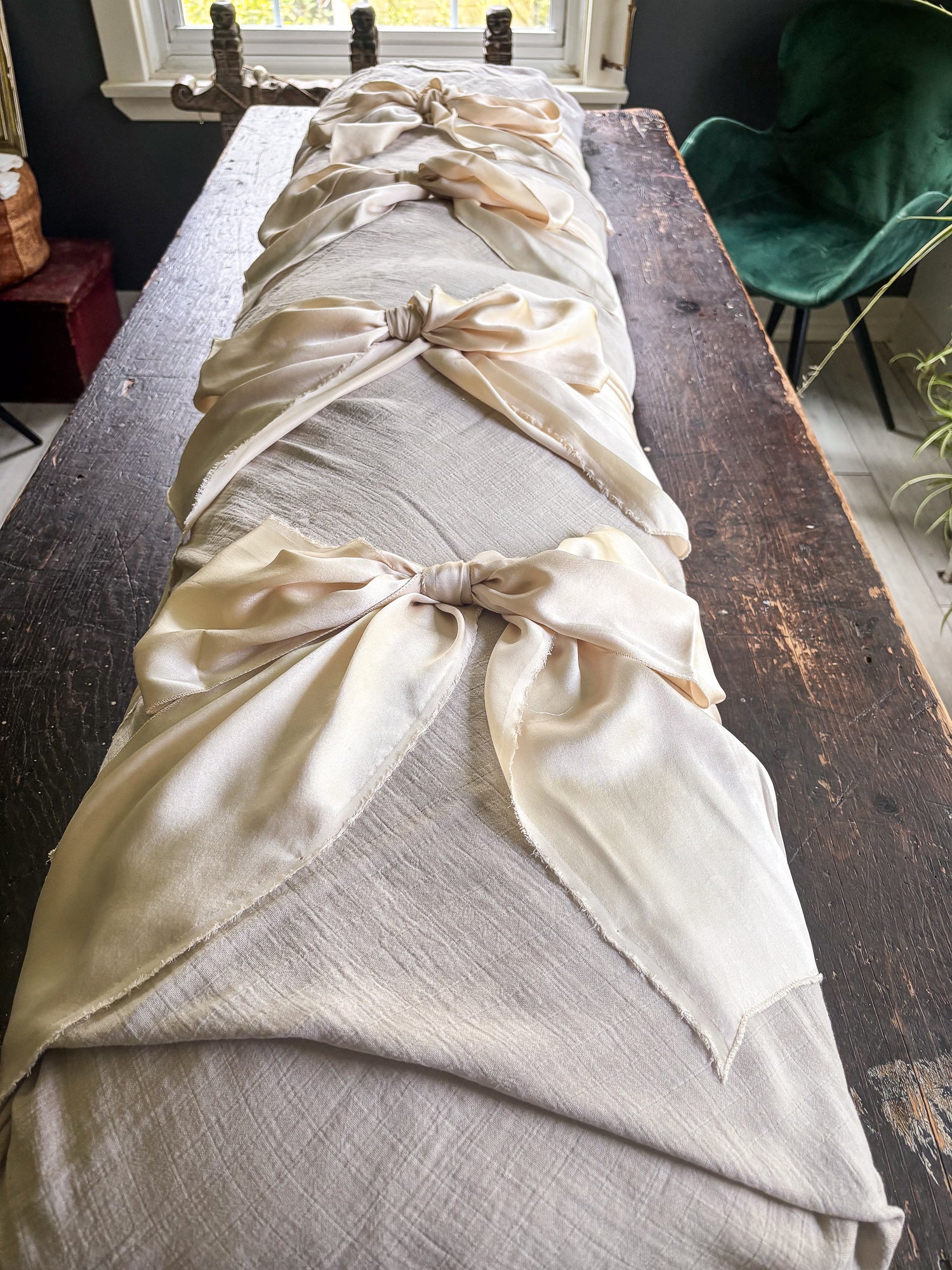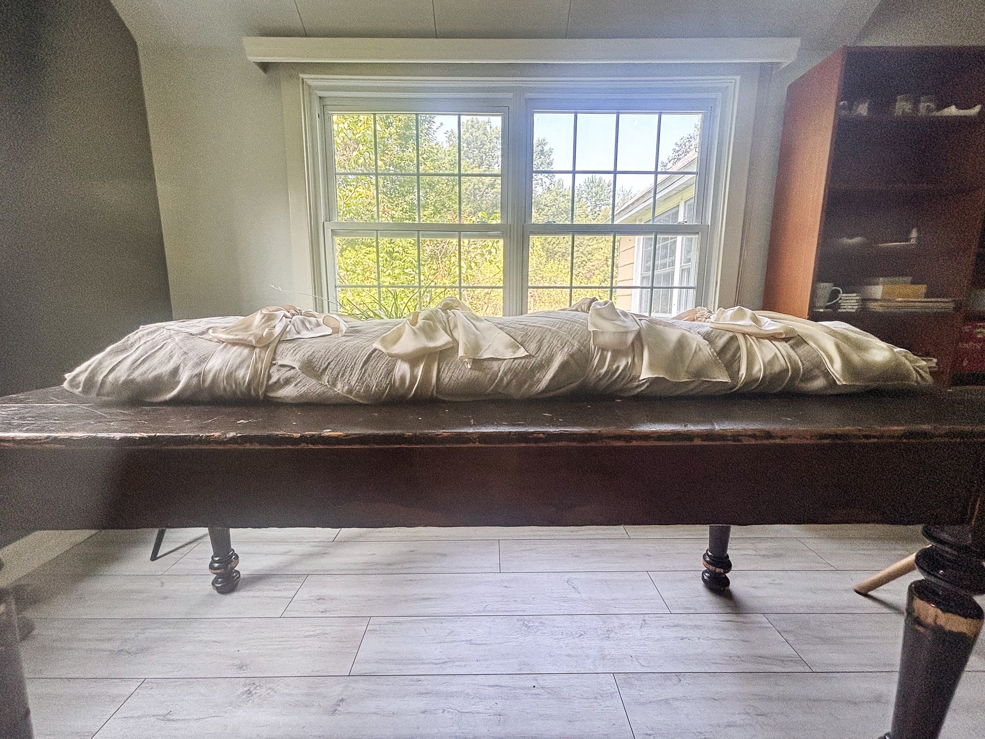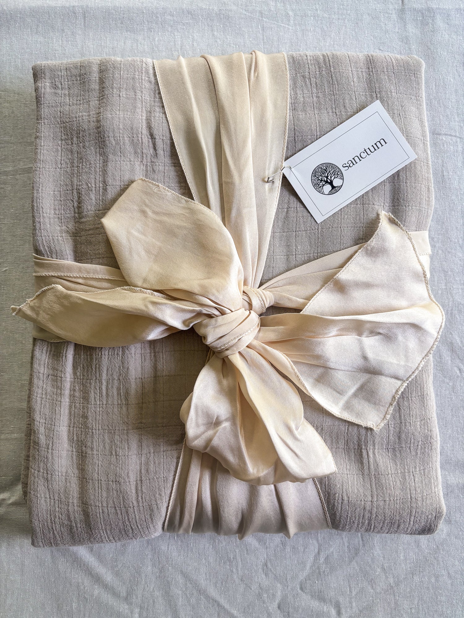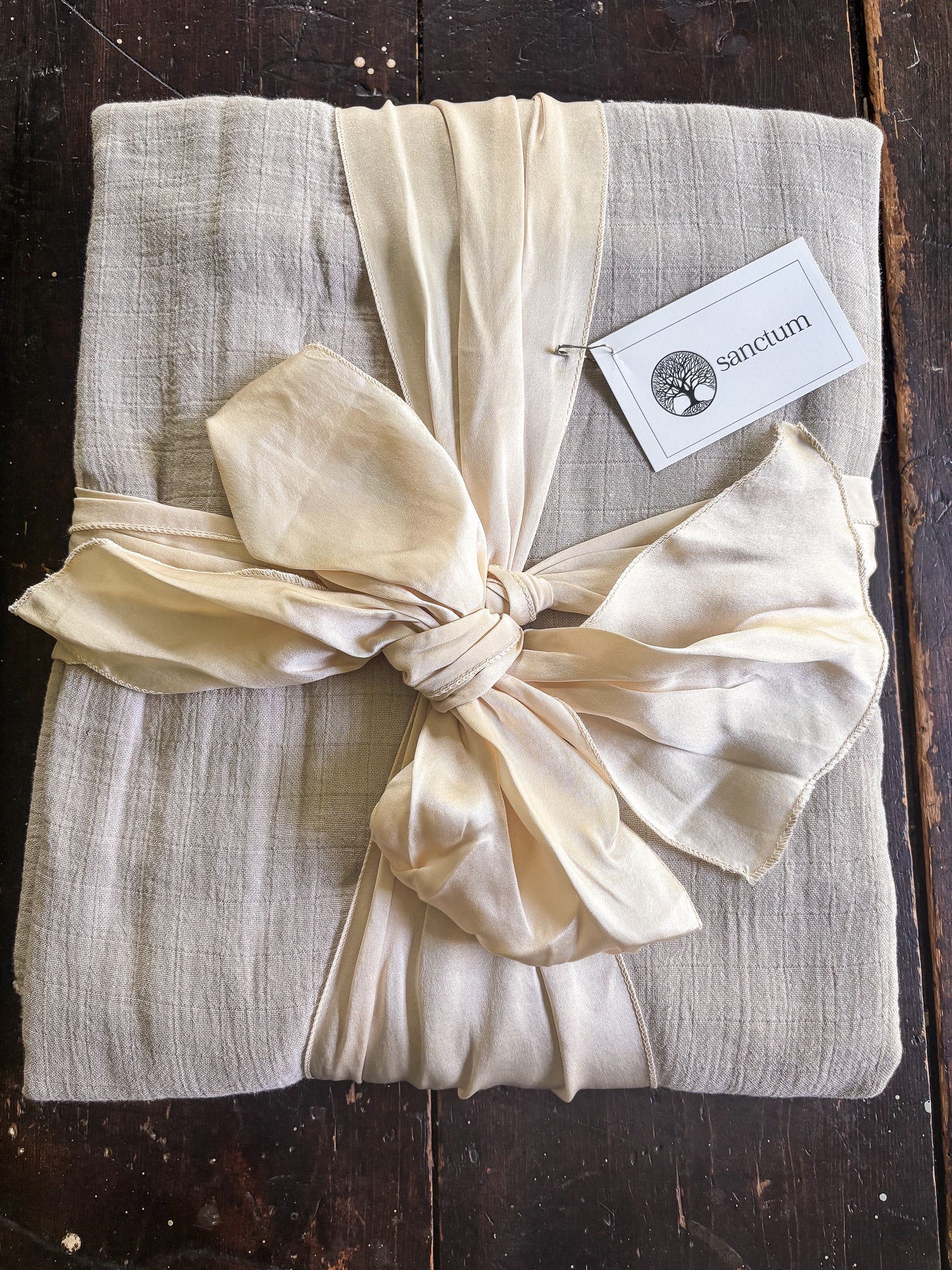 Sanctum shrouds are made by hand in Quebec with care, reverence, and an eye for natural beauty. We believe a shroud should be as unique as the life it honours — a final gift to the earth and a soft embrace for the journey home.
