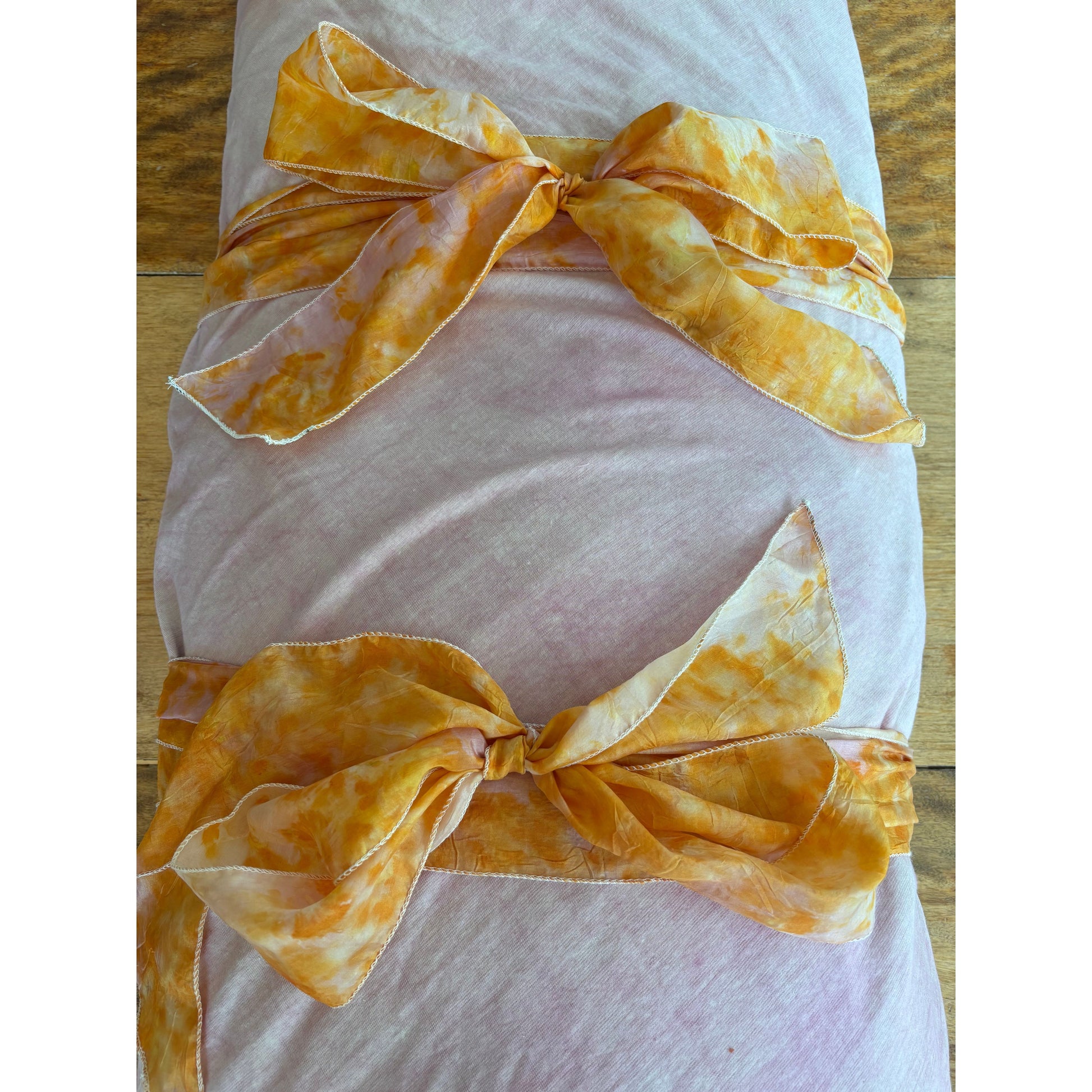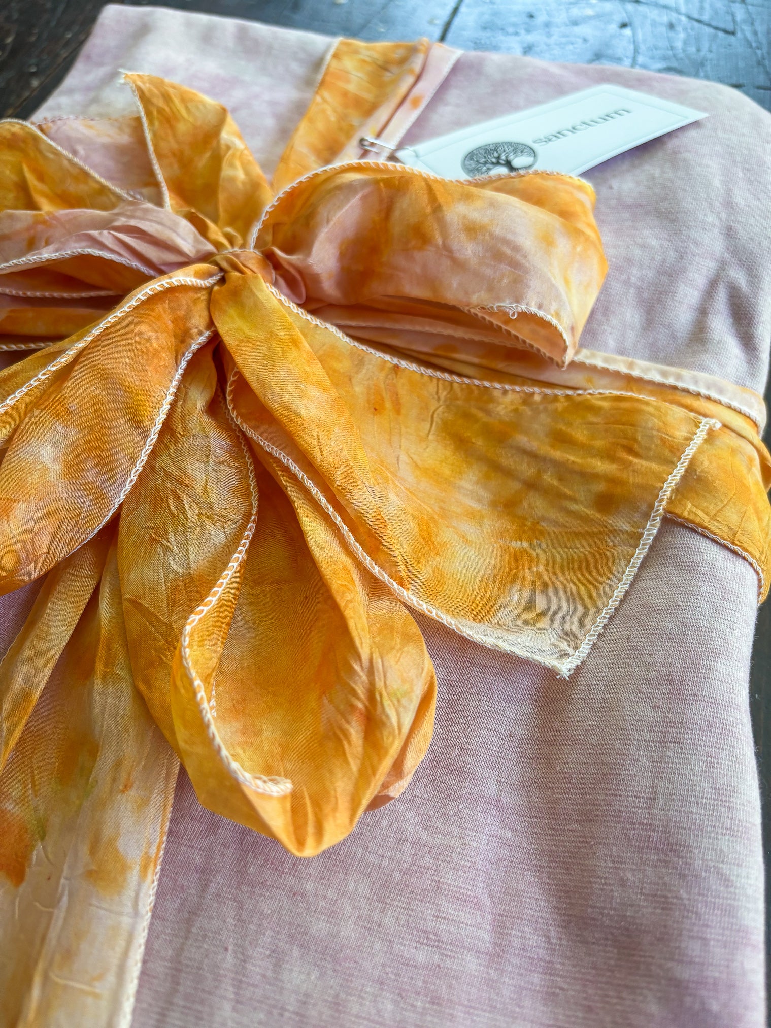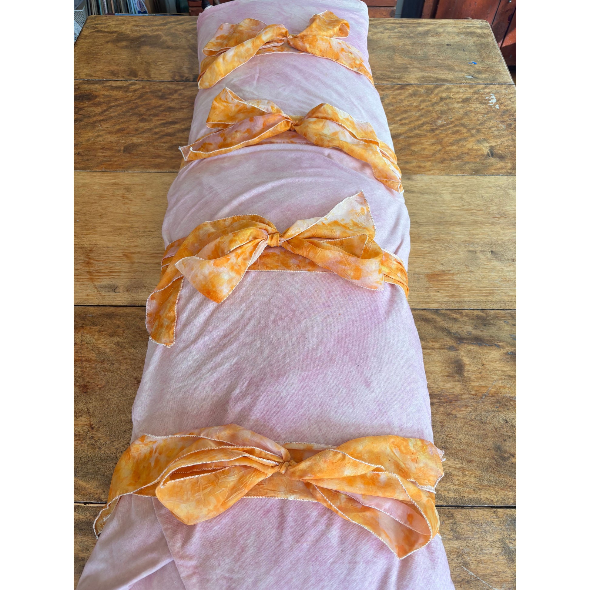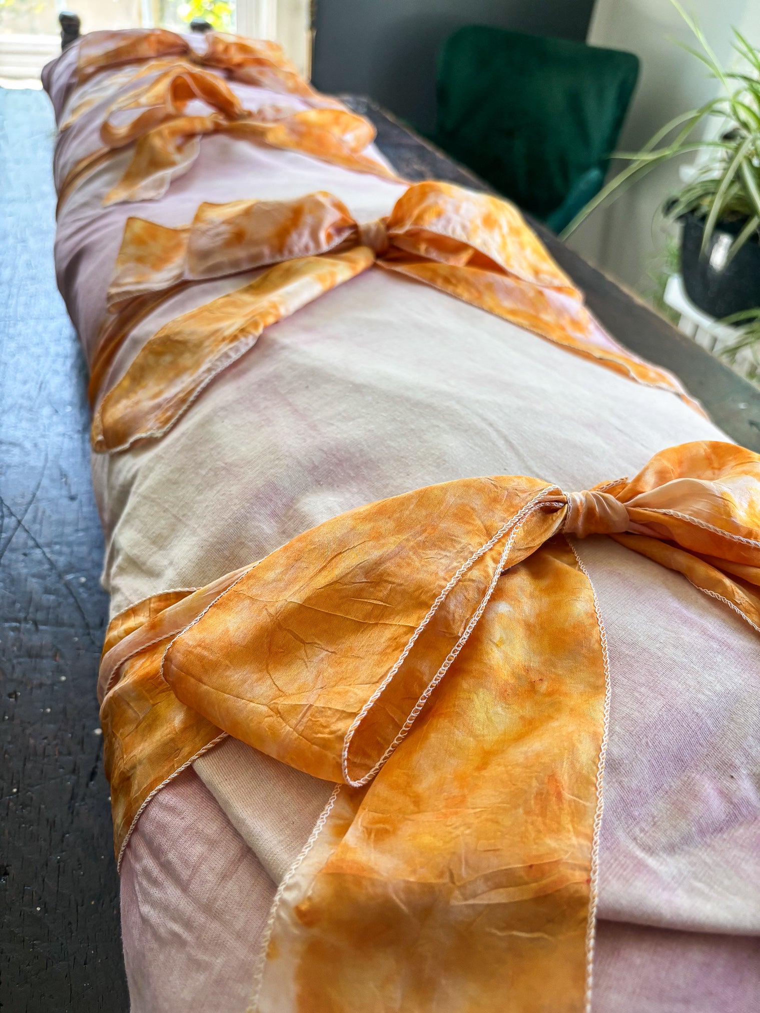 This shroud has been soaked in a cochineal dye bath. The silk ties have been eco-printed with cosmos and marigolds.