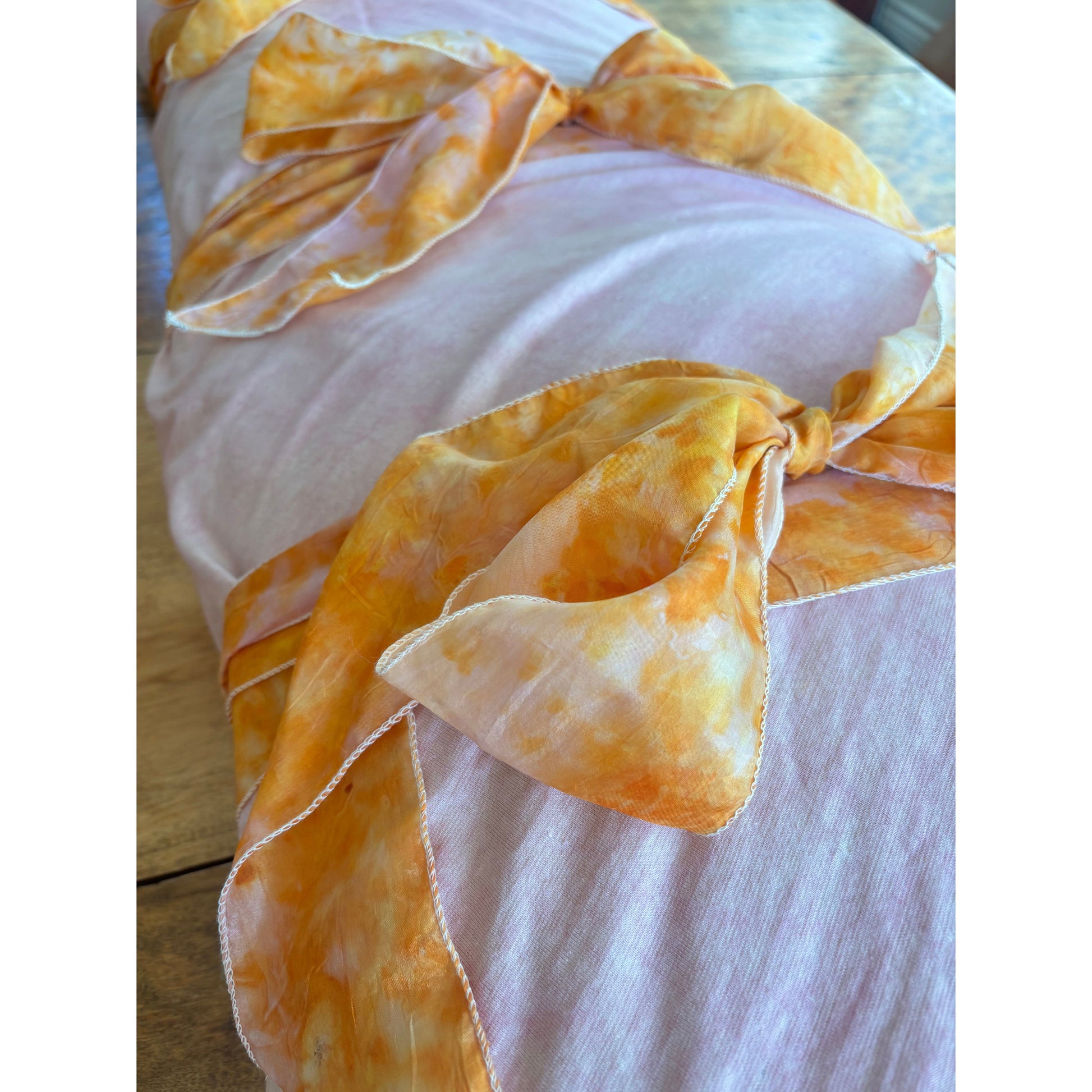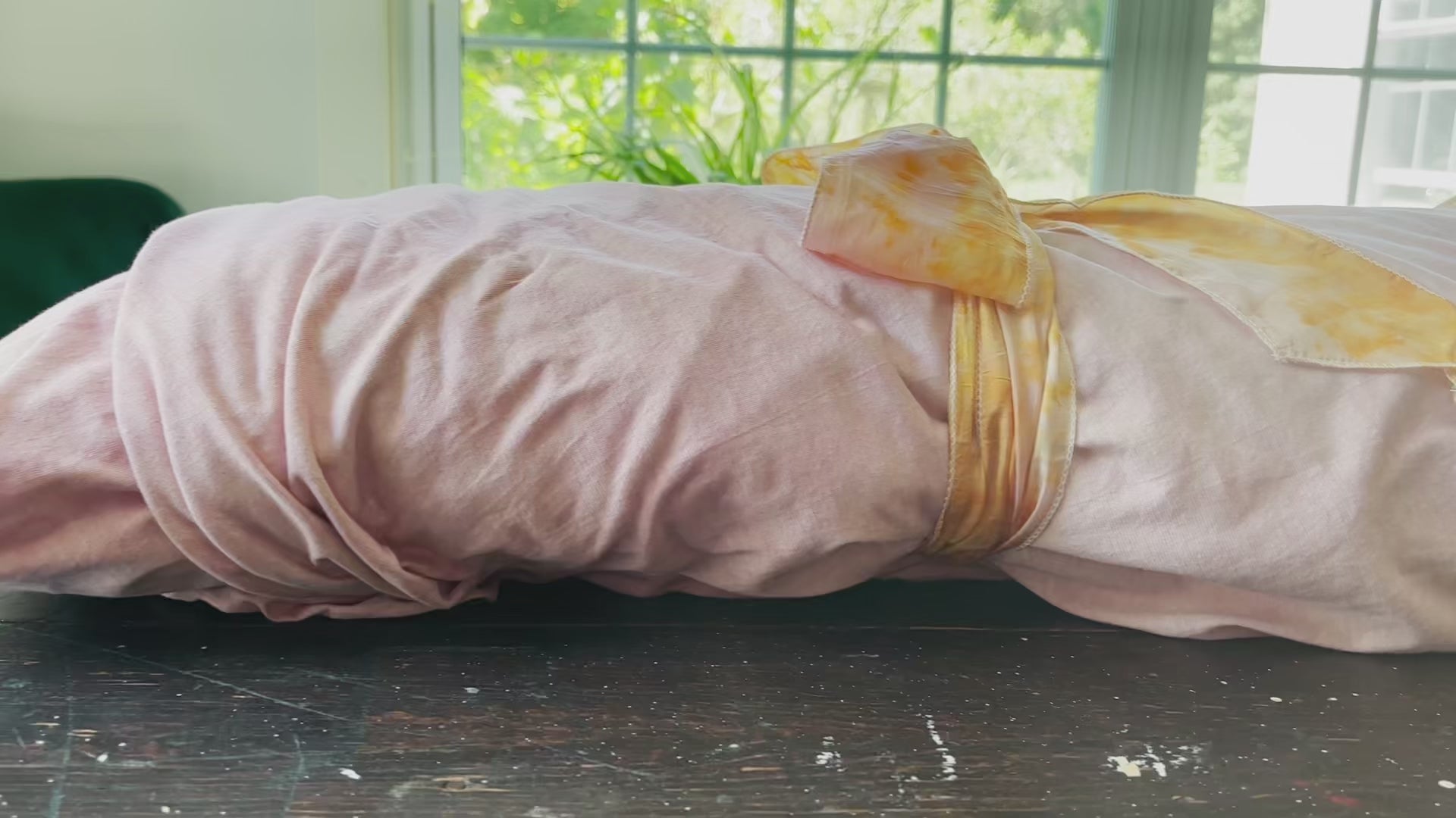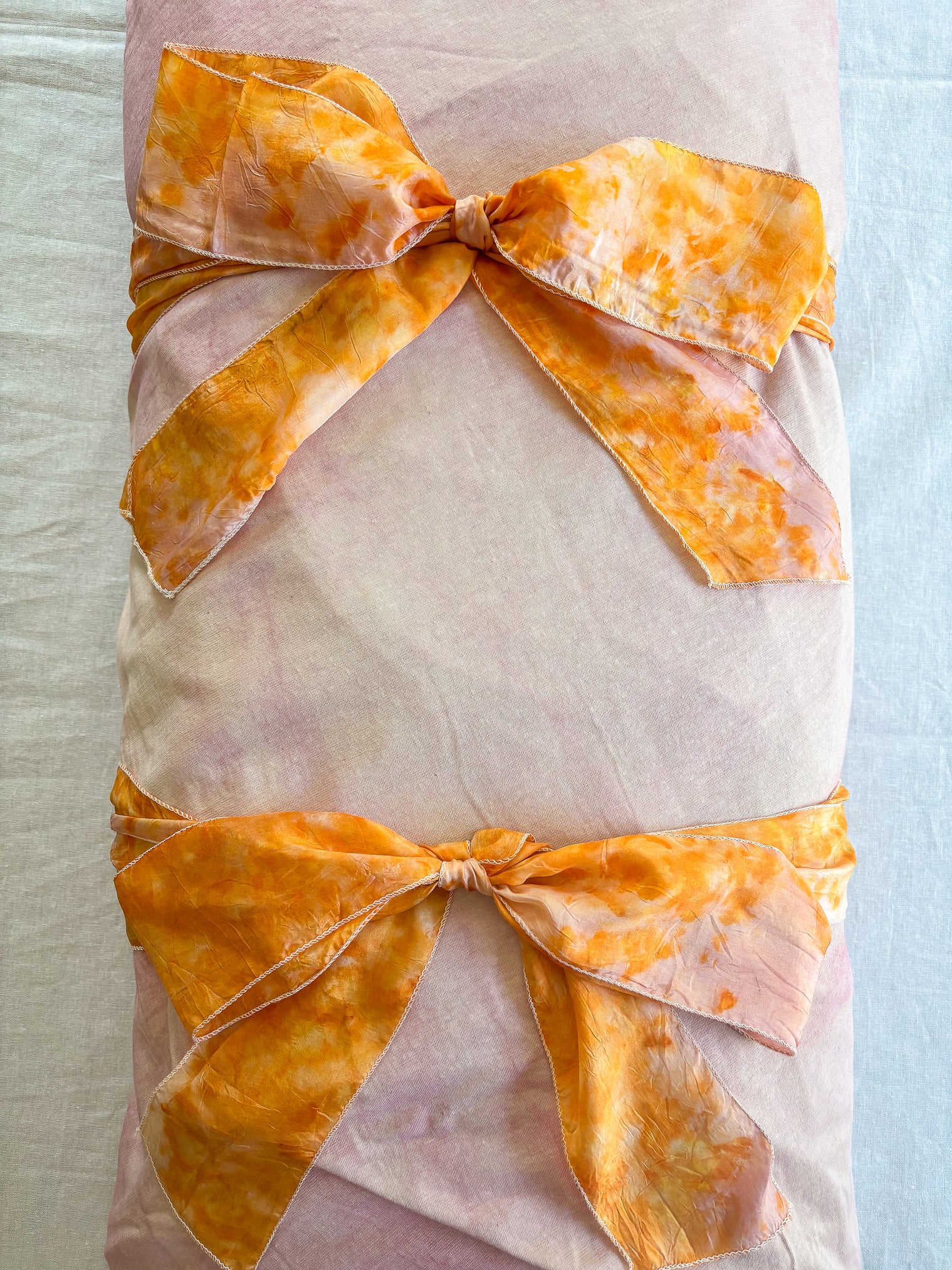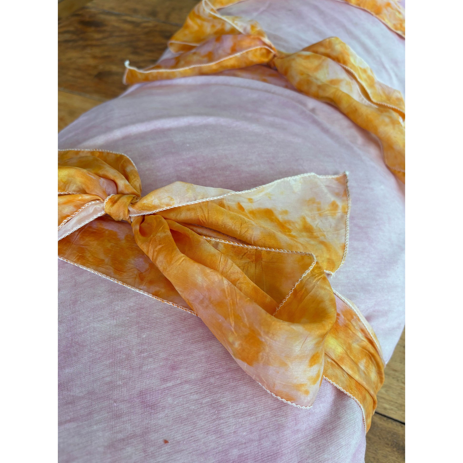This shroud has been soaked in a cochineal dye bath. The silk ties have been eco-printed with cosmos and marigolds.
