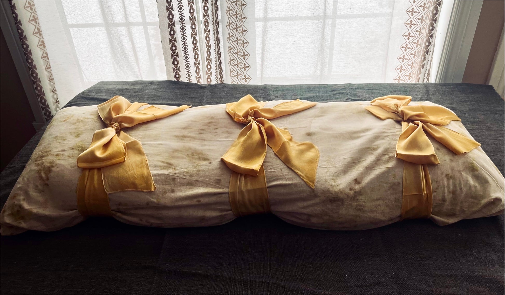 Crafted from a breathable cotton-hemp jersey, these shrouds are soft, stretch gently, and offer the perfect balance of strength and grace. They’re ideal for natural burial, home funerals, and green cemeteries. This shroud has been eco-dyed with dried flowers for a unique printed effect.