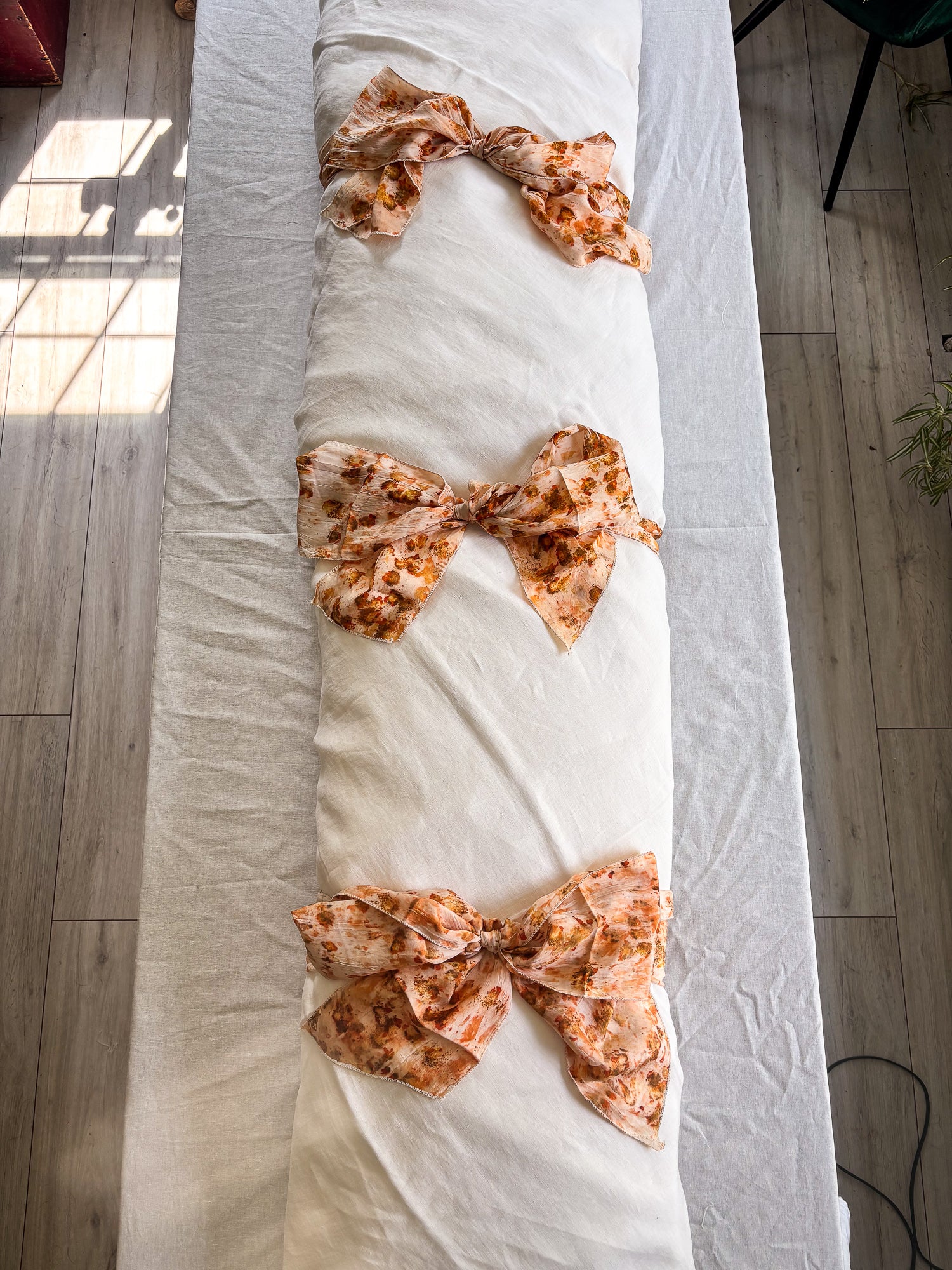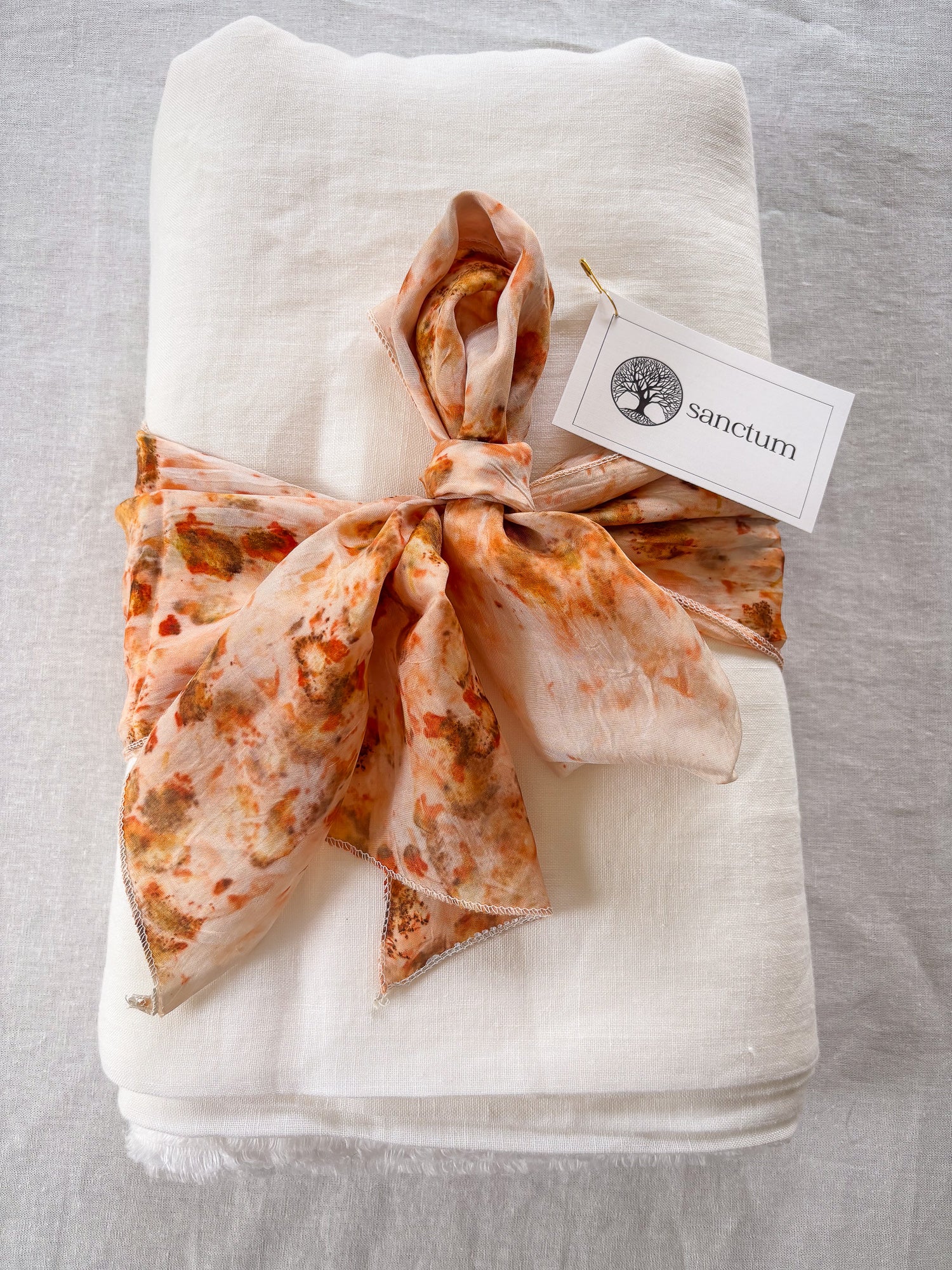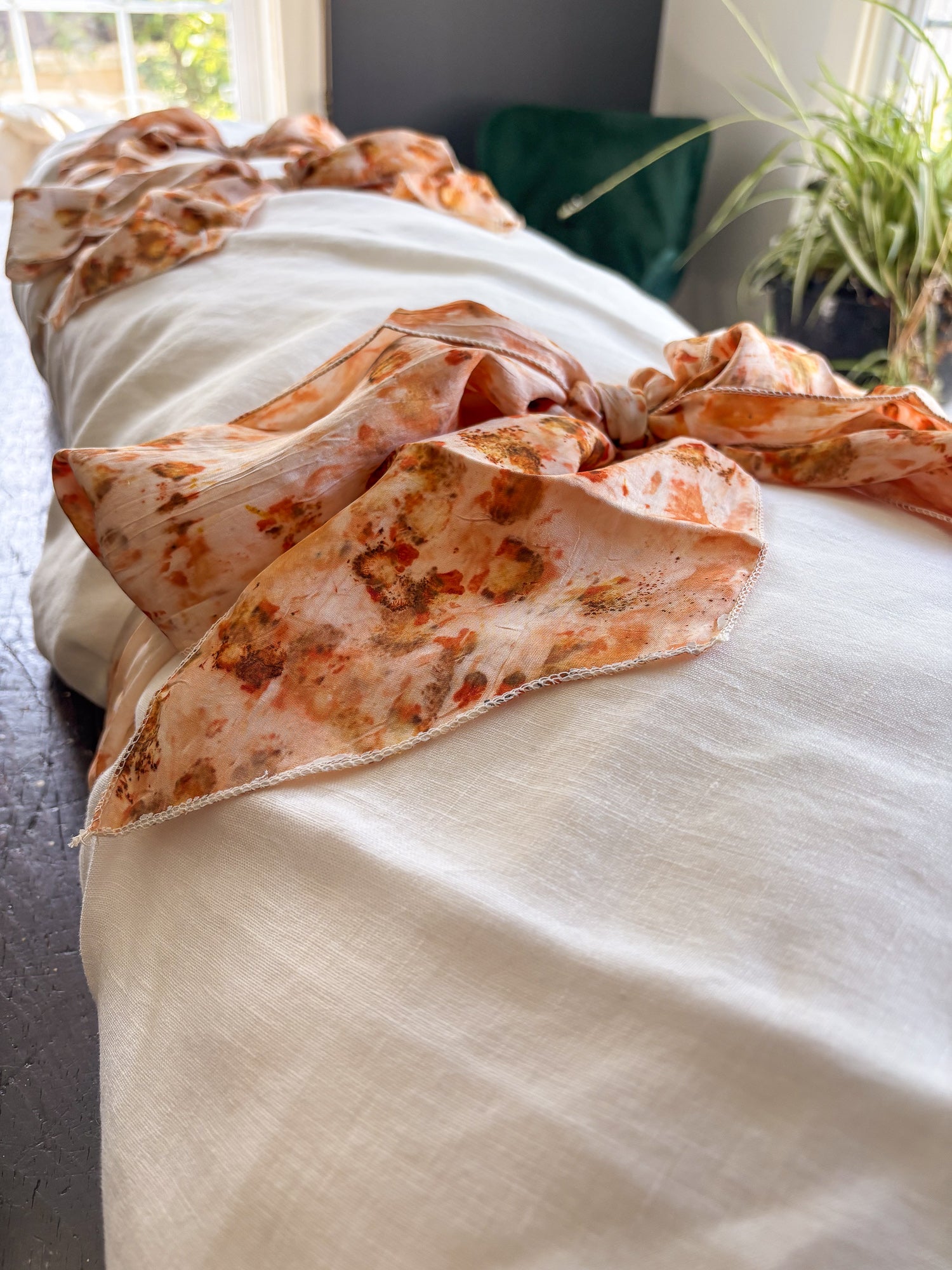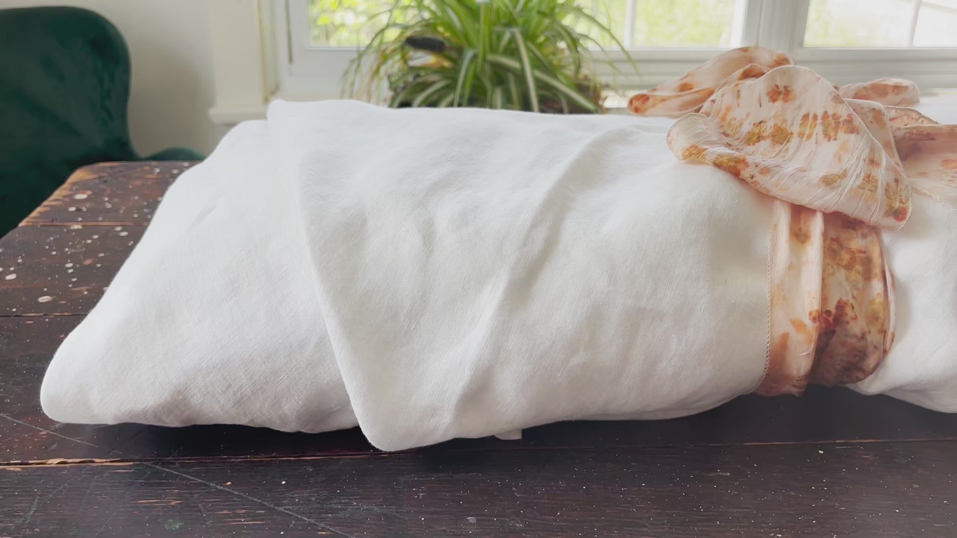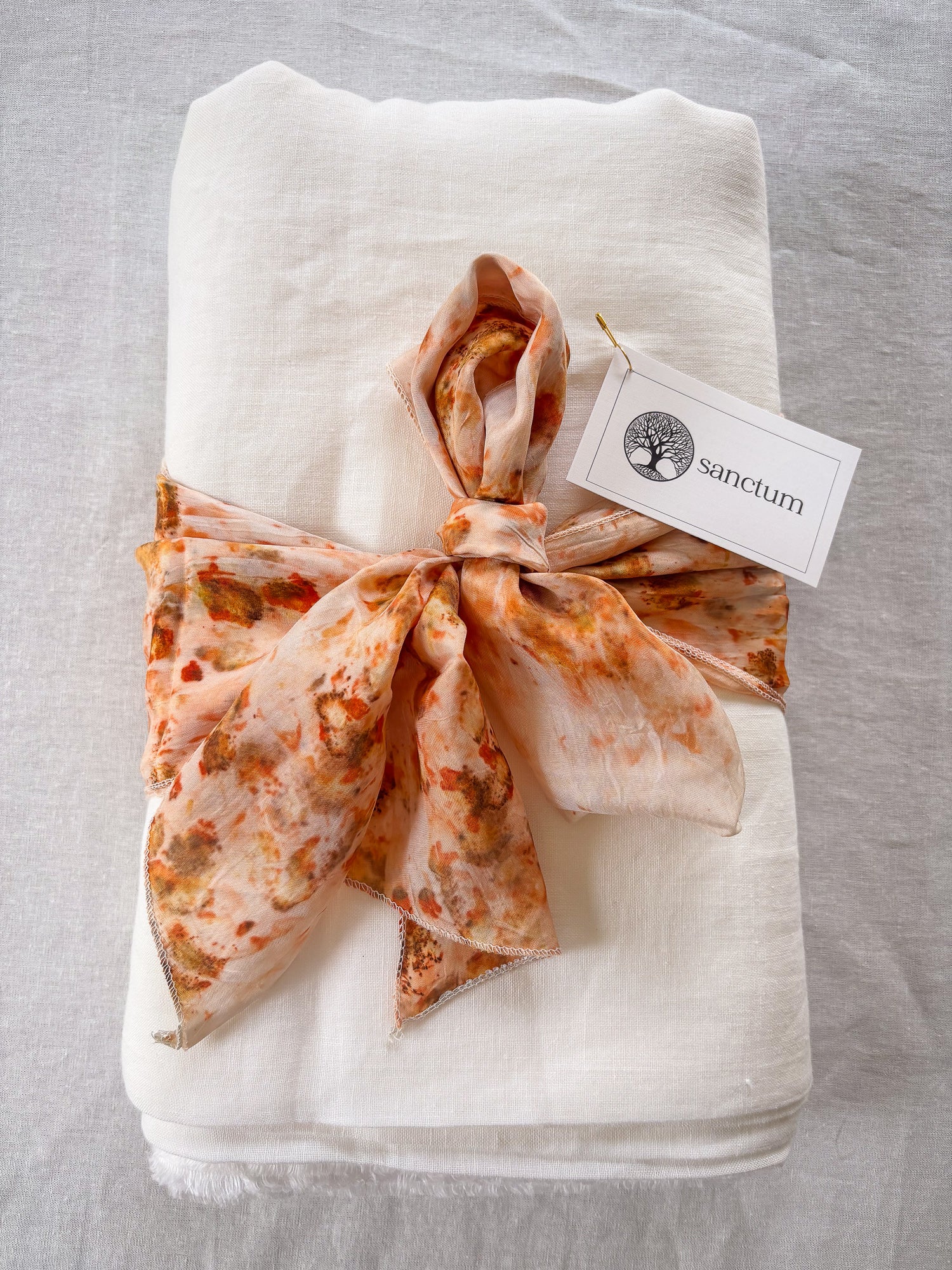 The Lino Collection is made from naturally bleached or dyed linen — soft, breathable, and timeless. Each shroud drapes beautifully and is finished with hand-tied ribbons, some adorned with subtle floral eco-prints or raw silk accents.