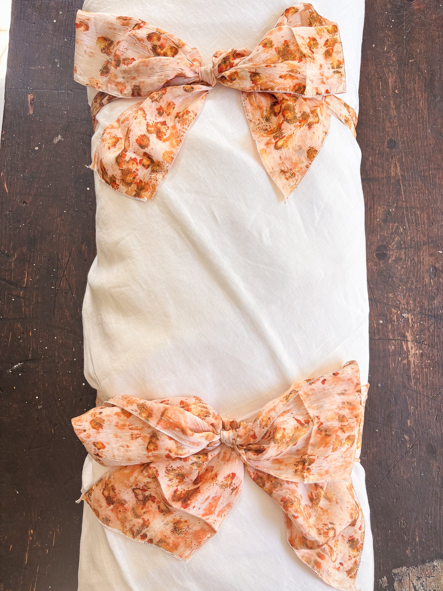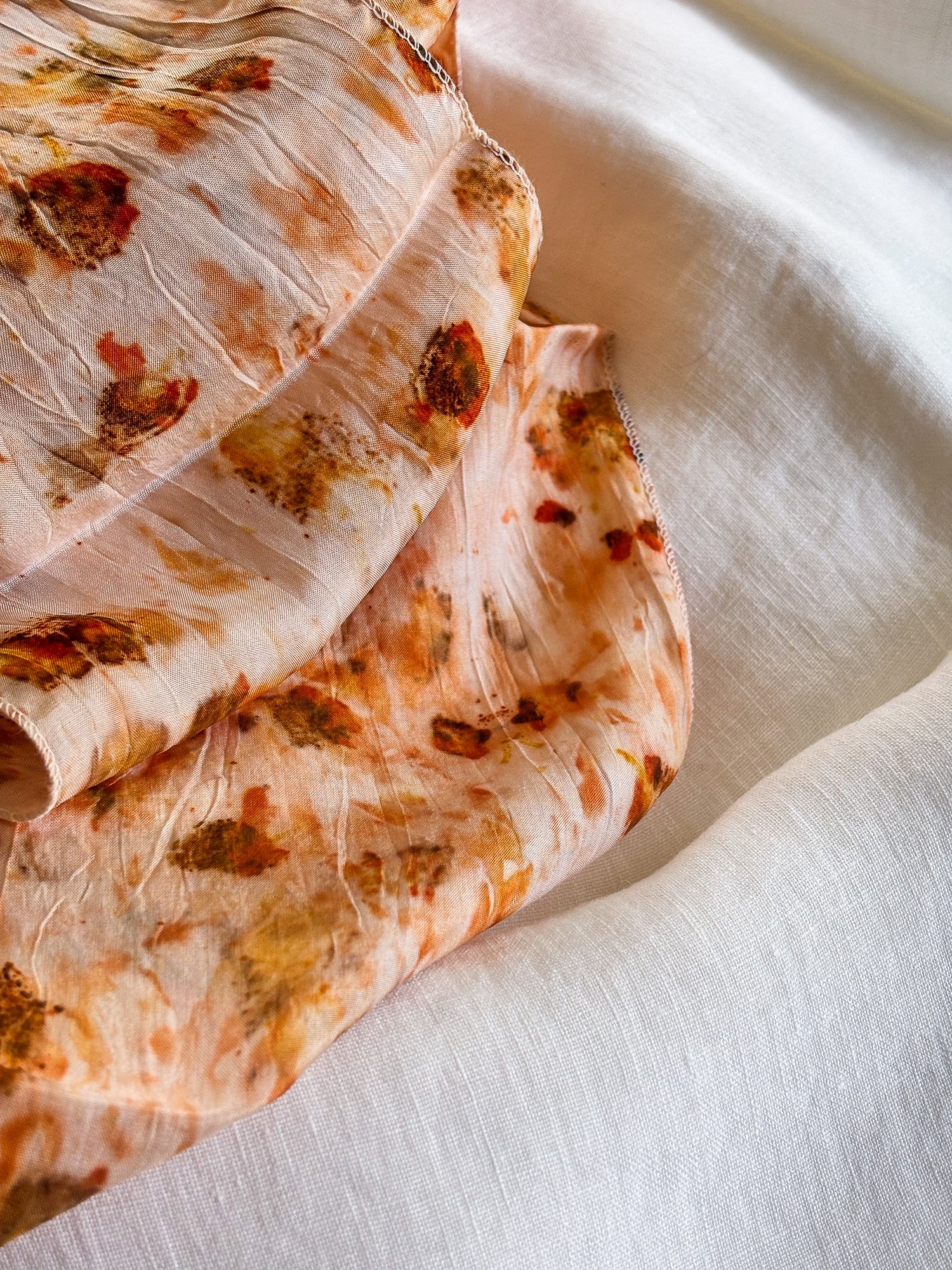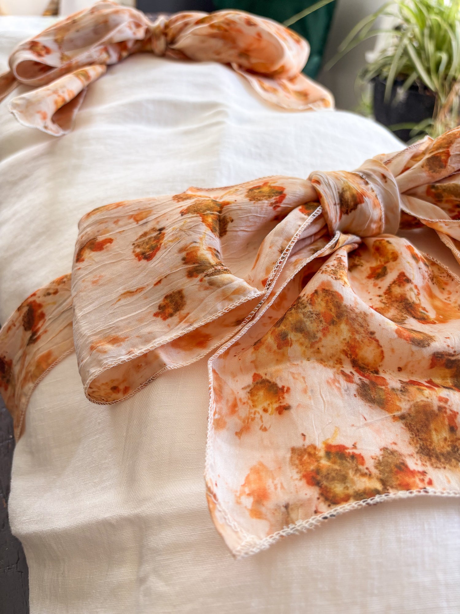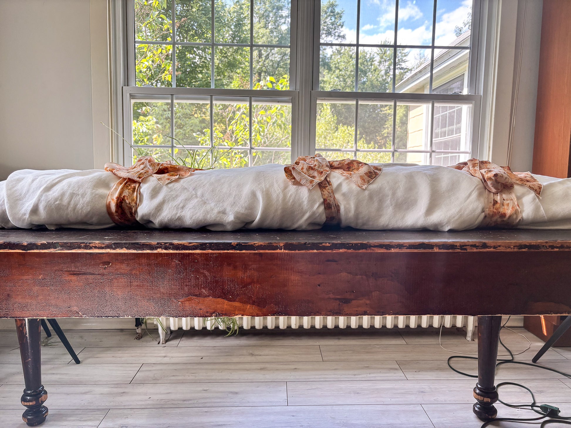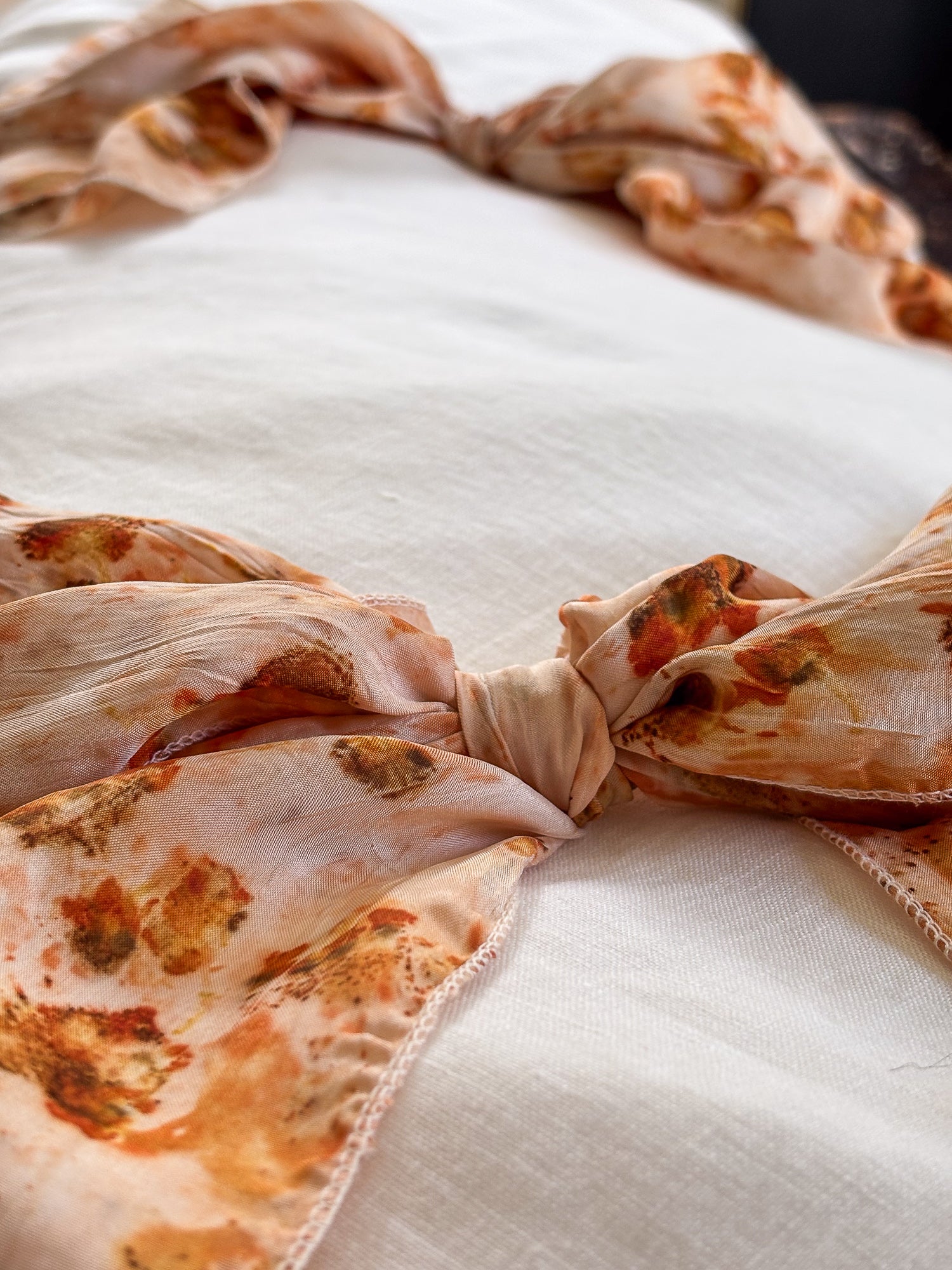 The Lino Collection is made from naturally bleached or dyed linen — soft, breathable, and timeless. Each shroud drapes beautifully and is finished with hand-tied ribbons, some adorned with subtle floral eco-prints or raw silk accents.